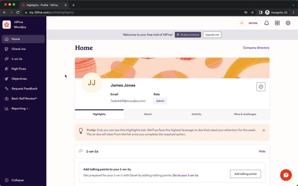 15Fiveoffers easy-to-use tools for employee check-ins and feedback. Its strengthlies in simple goal tracking and continuous communication. The software shines with its engagement surveysand coaching features that help managers support their teams effectively.