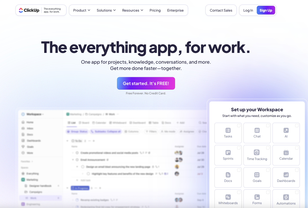 Designed to simplify how you manage tasks, deadlines, and collaboration, ClickUp puts everything in one place so you can focus on what really matters—getting work done efficiently. Whether you’re handling a small project or managing a large team, ClickUp adapts to your style, helps you automate repetitive tasks, and keeps everyone aligned.