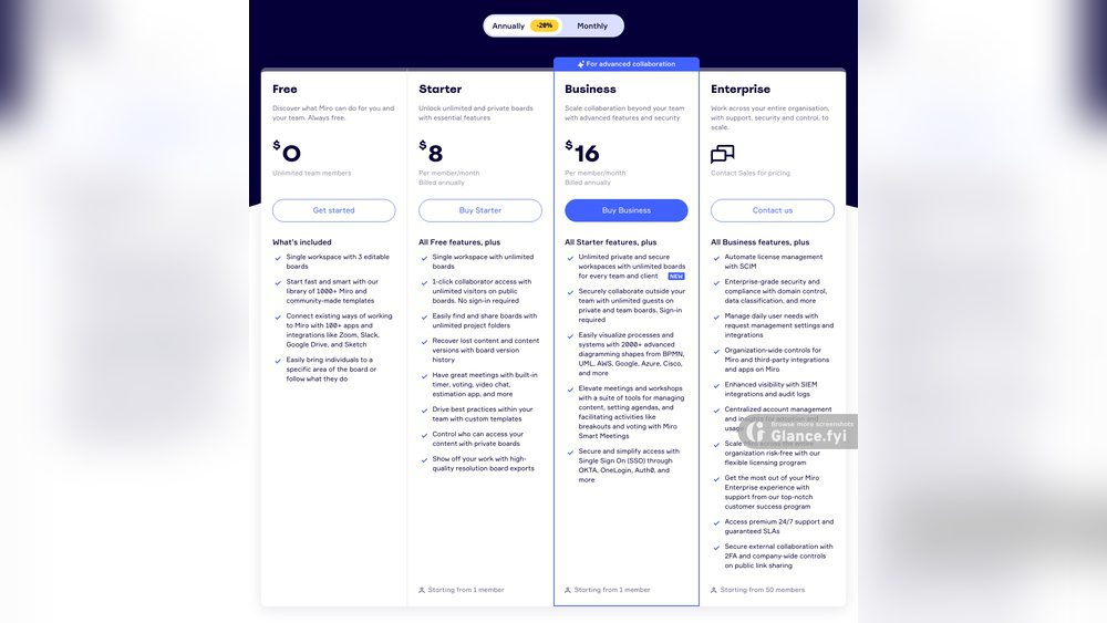 Miro Pricing depends on several features. Here are key ones that change with different plans:
