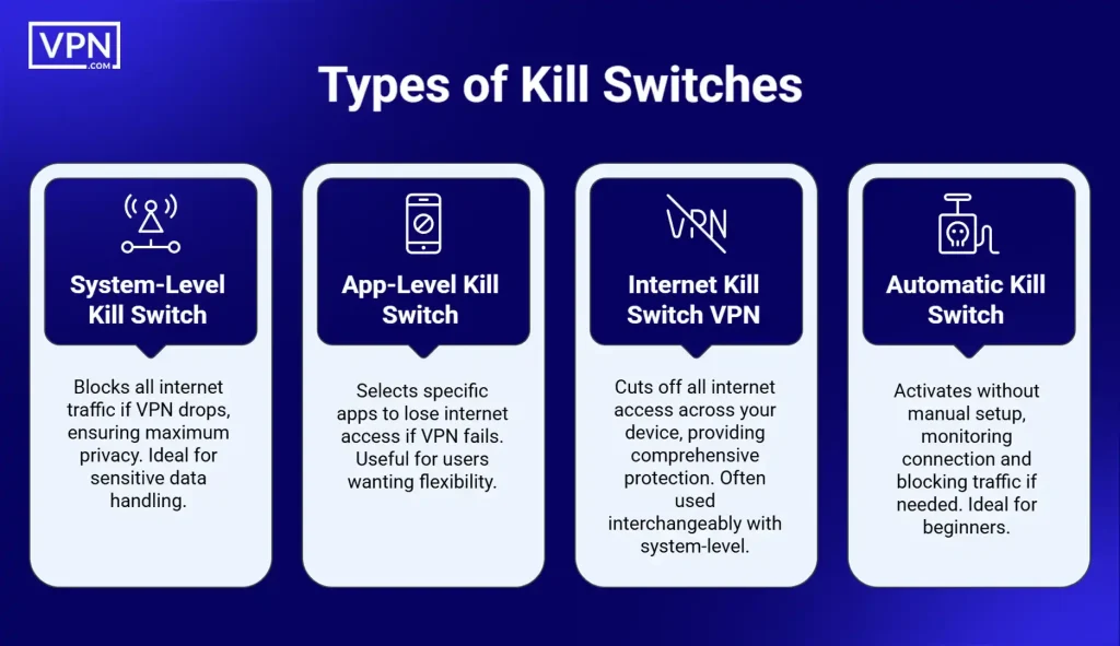 There are two main types of kill switches. The first is the system-wide kill switch. It stops all internet activity on your device. This ensures complete protection but can interrupt all online tasks.